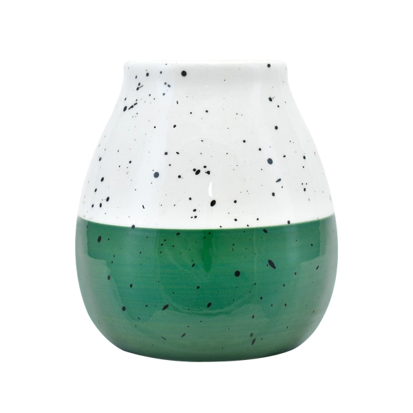 Tykwa ceramiczna Papagayo to stylowe naczynko do yerba mate o pojemności około 300-350 ml. Kształtem przypomina klasyczną tykwę. Szkliwiona wewnątrz i na zewnątrz. Wykończona jasnym kolorem, z czarnymi, nieregularnymi plamkami i designerskim odcięciem u dołu – w zielonym kolorze. Matero jest solidnie wykonane, z wysokiej jakości ceramiki. Jest odporne na uszkodzenia mechaniczne. Picie yerby z takiego naczynka to czysta przyjemność!
