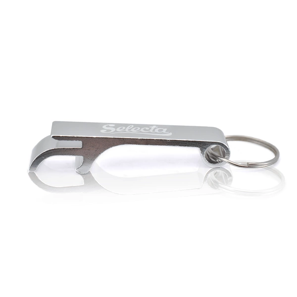 Otwieracz do butelek z logo marki Selecta w srebrnym kolorze. Wyposażony w breloczek, dzięki czemu można przypiąć go np. do kluczy.