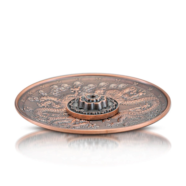 Poczuj magię Orientu! Okrągła podstawka pod kadzidło „Dragon" to wyjątkowe akcesorium w dalekowschodnim stylu, wykonane z wysokiej jakości stopu cynku. Ozdobiona motywem dwóch smoków, które w Chinach uważane są za symbol siły, władzy, pewności siebie i odwagi. Symbol smoka pojawia się w wielu kulturach, ale azjatyckie smoki są wyjątkowe – sprzyjają ludziom, a wiele osób wierzy, że są symbolem szczęścia. W środkowej części podstawkę przyozdobiono chińskim symbolem oznaczającym błogosławieństwo. Do kadzielnicy dołączona jest mniejsza podstawka w kształcie mandali, wyposażona w niewielki otwór, w którym można umieścić kadzidło w formie patyczka. W ten sposób kadzidło nie wypada podczas palenia, a cały popiół pozostaje na większej podstawce.