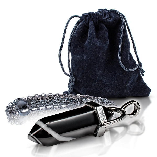 Forma: szlifowany czarny agat w metalowej oprawie (z łańcuszkiem), zapakowany w czarny woreczek