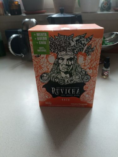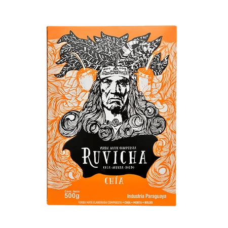 Ruvicha Chia pochodzi wprost z Paragwaju, od młodej, prężnie rozwijającej się marki Ruvicha, powstałej w 2016 roku. Zapakowana w worek i kartonik, z charakterystycznym wizerunkiem groźnie spoglądającego Indianina Guarani. To klasyczna, paragwajska yerba mate - mocna w smaku, dymna w aromacie, z 100 % naturalnymi dodatkami: nasionami chia, miętą i boldo. Ziołowy zapach unosi się już przy pierwszym otwarciu opakowania i utrzymuje się wciąż przy zalaniu suszu wodą. Nasiona szałwi hiszpańskiej, powszechnie nazywanej chia, znane są bogactwa cennych dla zdrowia witamin i minerałów. Ziołowe dodatki nadają kompozycji świeżości - świetnie sprawdza się zarówno w wersji ciepłej, jak i zimnej - tereré.