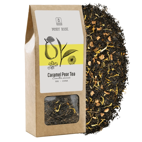 - Herbata Mary Rose Caramel Pear to perfekcyjnie skomponowane połączenie czarnej herbaty yunnan i słodko korzennych dodatków w postaci gruszki, imbiru, płatków nagietka i aromatów, w tym naturalnego aromatu karmelu.